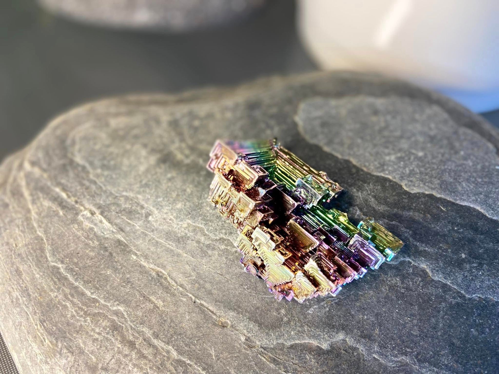 Unlike most crystals, Bismuth modifies the energy at the crown and sends kundalini energy back down the spine to the root chakra.