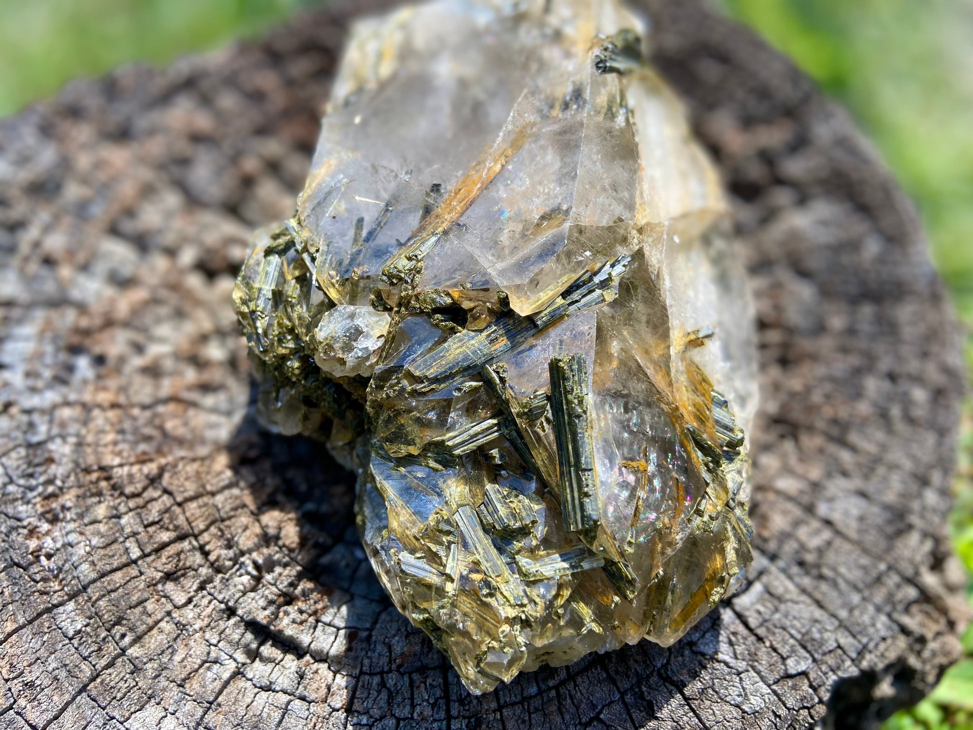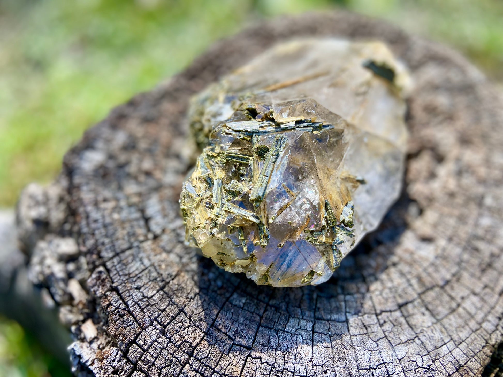 Born from the union of Clear Quartz and rich green Epidote, my crystalline body is a beacon of growth, prosperity, and transformation. I hold the vibrations of the Earth’s primal wisdom, aligning with the devas, nature spirits, and angelic realms. My presence encourages the release of negativity, urging you to shed old patterns and embrace new, luminous ways of being. I am here to guide you through cycles of renewal, to help you evolve, and to bring you into harmony with the greater cosmic flow.