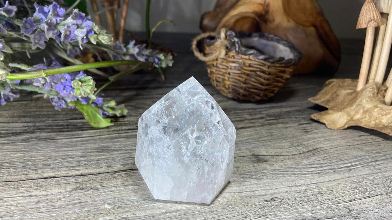 The Fire and Ice Crackle Quartz Generator embodies a harmonious balance between the contrasting elements of fire and ice. This exquisite piece represents the transformative energy of fire and the calm clarity of ice, creating a dynamic and balanced aura.