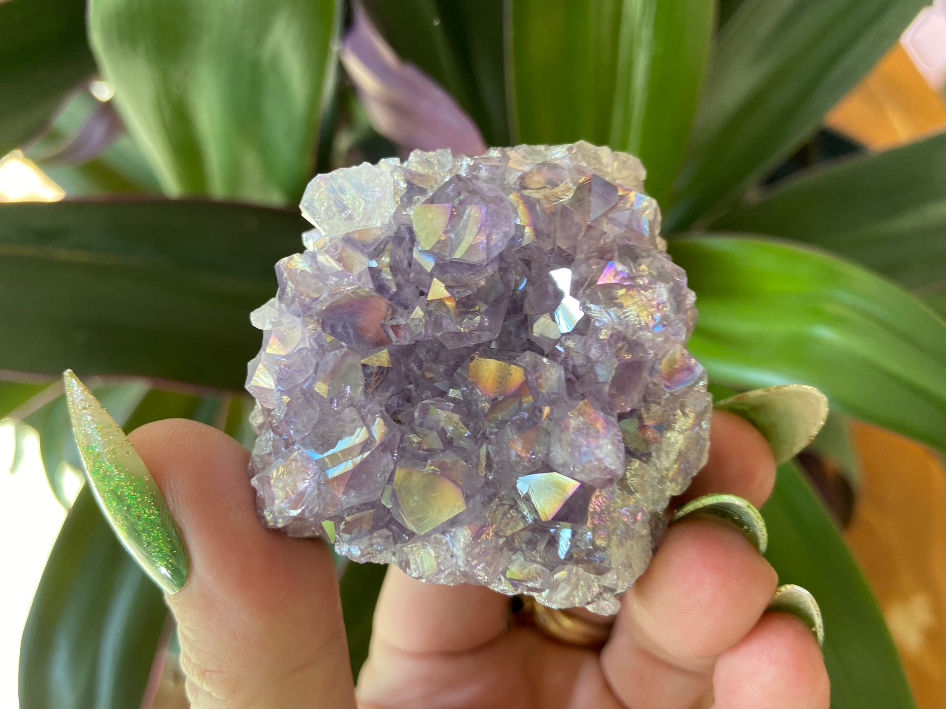 These Pearl Amethyst Angel Aura Quartz Clusters are little pockets of pure celestial magic — each one a radiant fusion of light, joy and transformation. Born from natural Quartz that has been alchemically bonded with fine vapours of platinum, gold and silver at over 1600°F, these clusters shimmer with an ethereal rainbow glow, reminiscent of angel wings in sunlight.