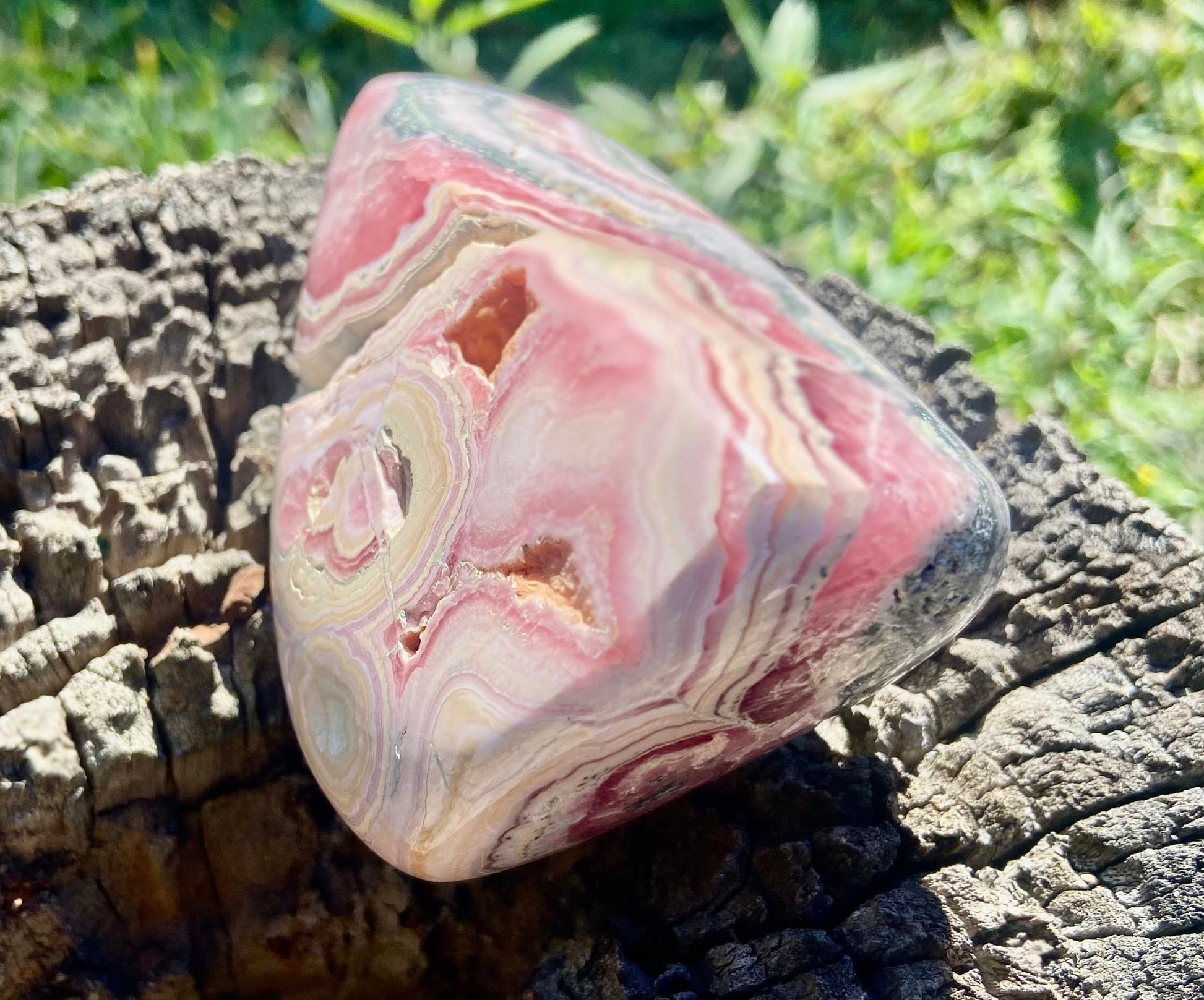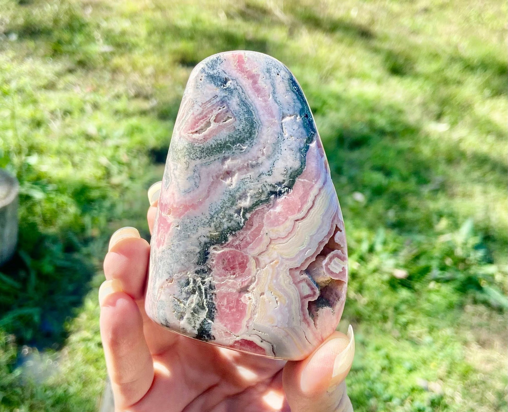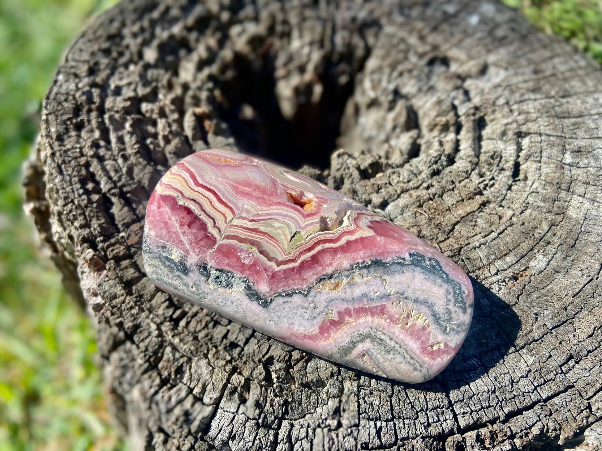This stunning, high-grade Rhodochrosite freeform is a true collector’s gem, hand-selected from the legendary Capillitas mining district in Catamarca, Argentina. Polished on both sides, it reveals breathtaking natural banding in vibrant pinks with hints of red and pyrite.