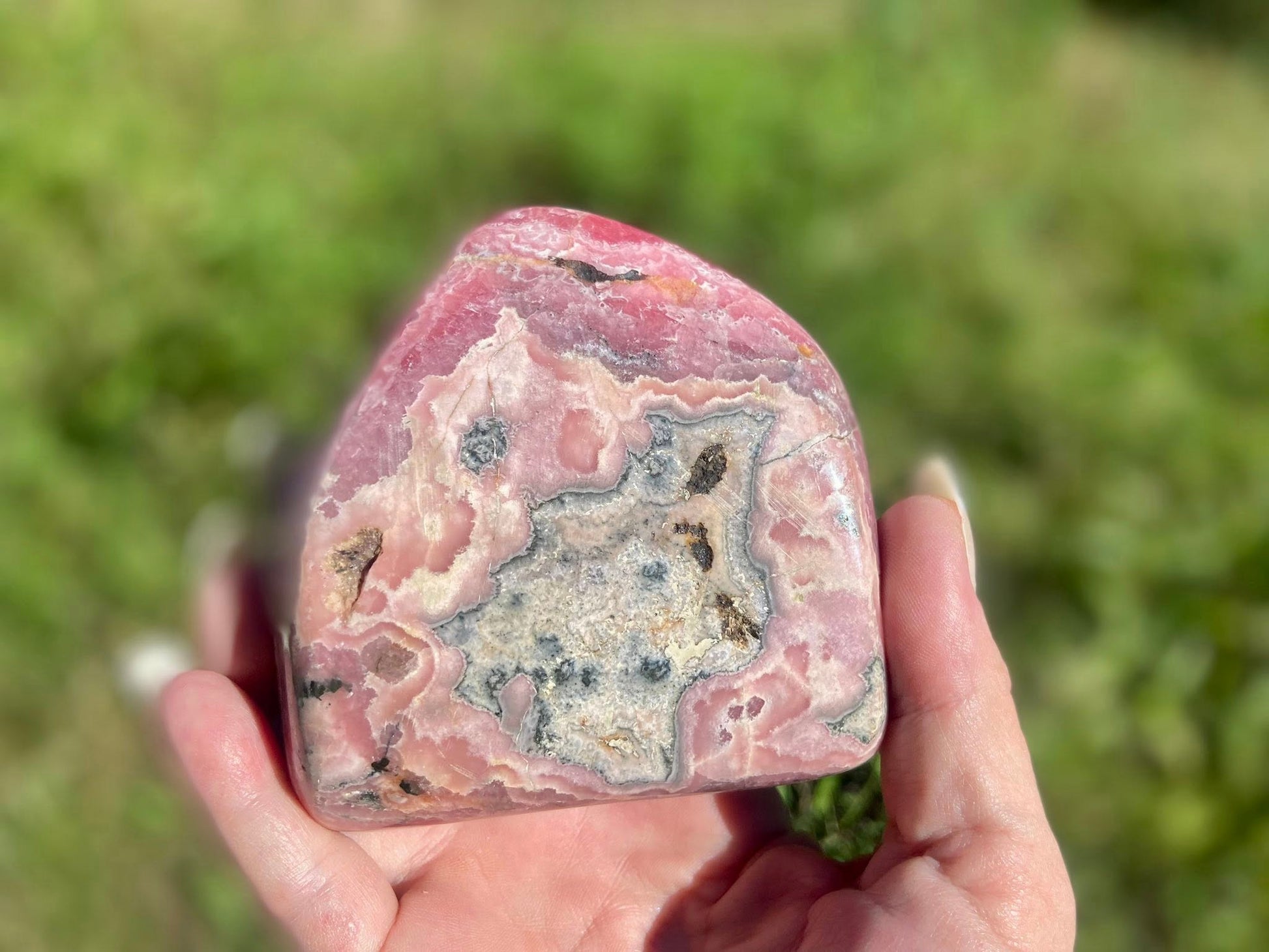 This stunning, high-grade Rhodochrosite freeform is a true collector’s gem, hand-selected from the legendary Capillitas mining district in Catamarca, Argentina. Polished on both sides, it reveals breathtaking natural banding in vibrant pinks with hints of red and pyrite.